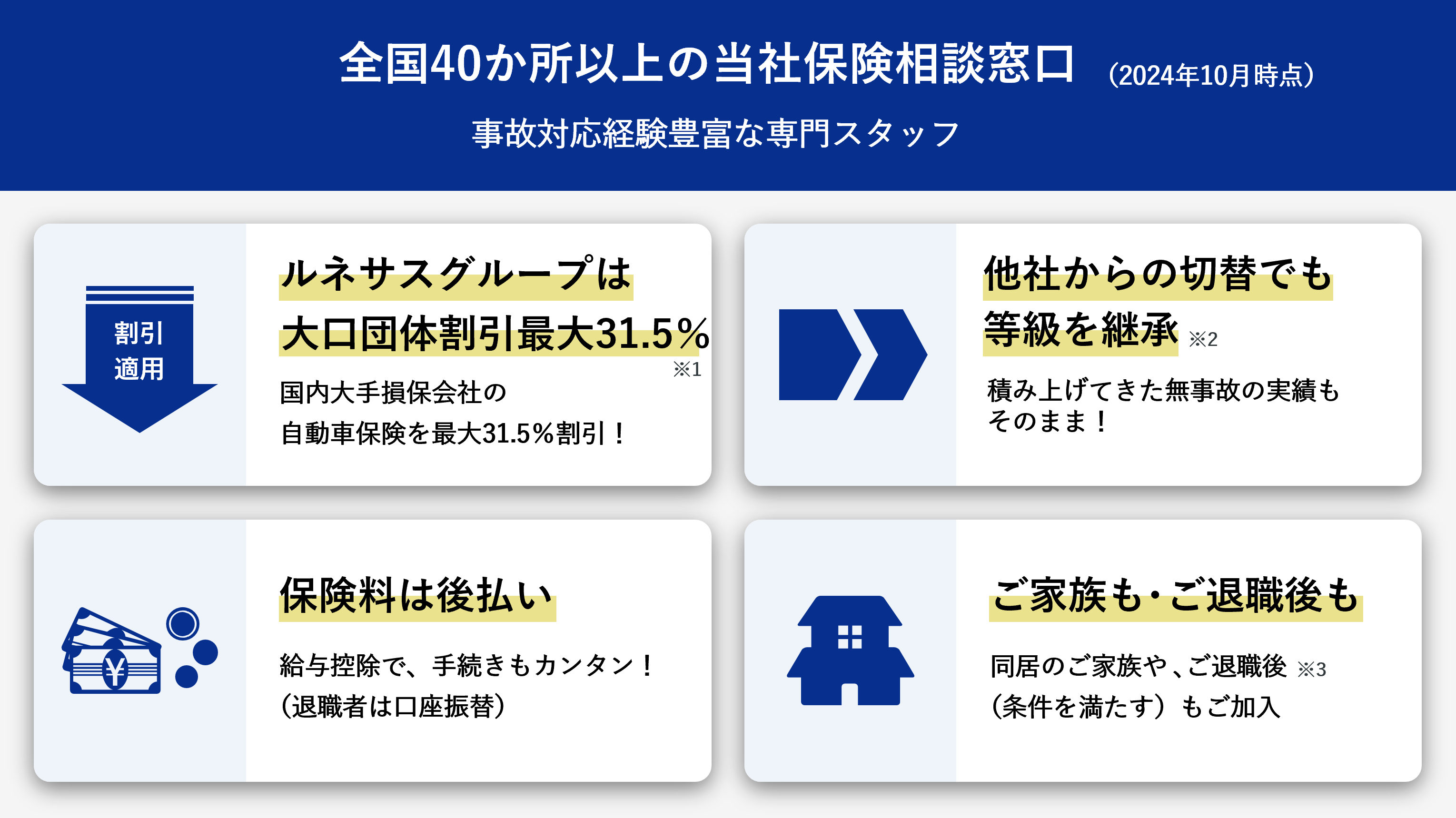 - ルネサスグループ制度保険(団体生命保険、団体疾病・傷害保険)に退職後継続加入し、団体扱自動車保険の取り扱いを希望する場合