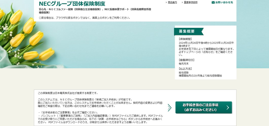 - ※正式名称:安心丸(団体総合生活補償保険(MS&AD型))/NECゴルファー保険(団体総合生活補償保険)/NEC長期休業サポート(団体長期障害所得補償保険)