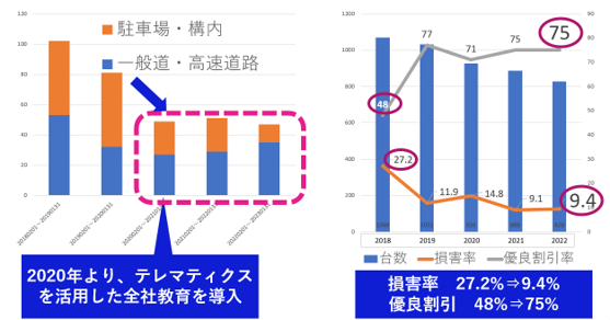 A社では、2020年よりテレマティクスのデータを活用した全社教育を導入した結果、下図のとおり交通事故発生件数は半減し、損害率は約およそ1/3に低減、保険料の優良割引率も最上限に達しました。