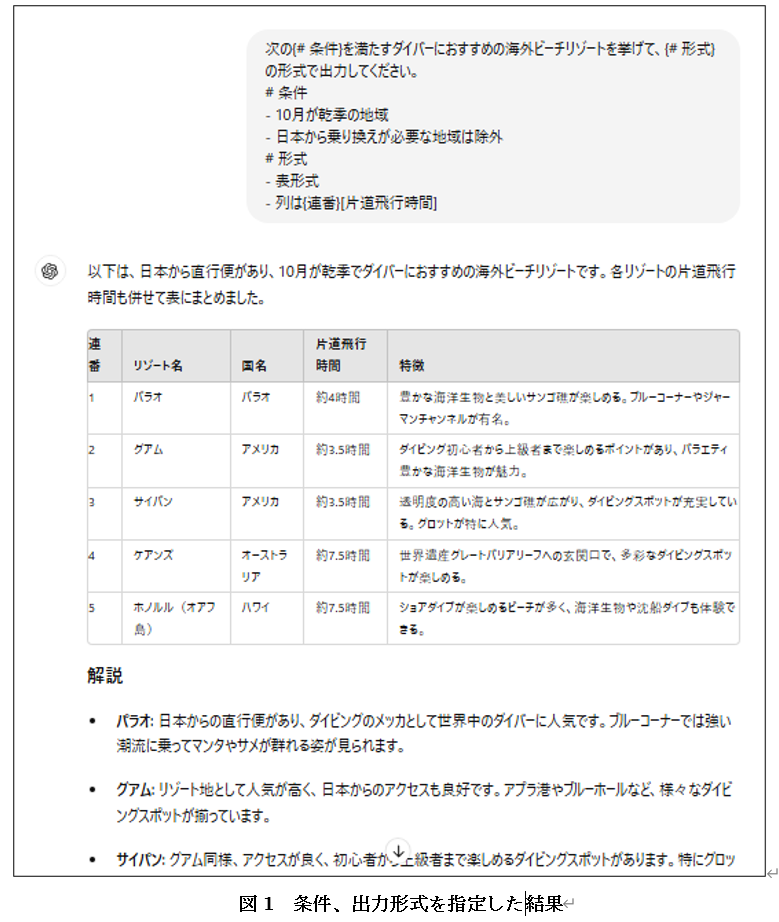 厄介なことに、ChatGPTなどの生成AIは、「おすすめの旅行先を紹介して」だけでも、それらしい回答を出してしまいます。「具体的な条件を提示し、何を知りたいのか」、「どんな形で回答を提示してほしいのか」を明確に伝えることで、より要望を満たす、精度の高い回答が得られるようになります。